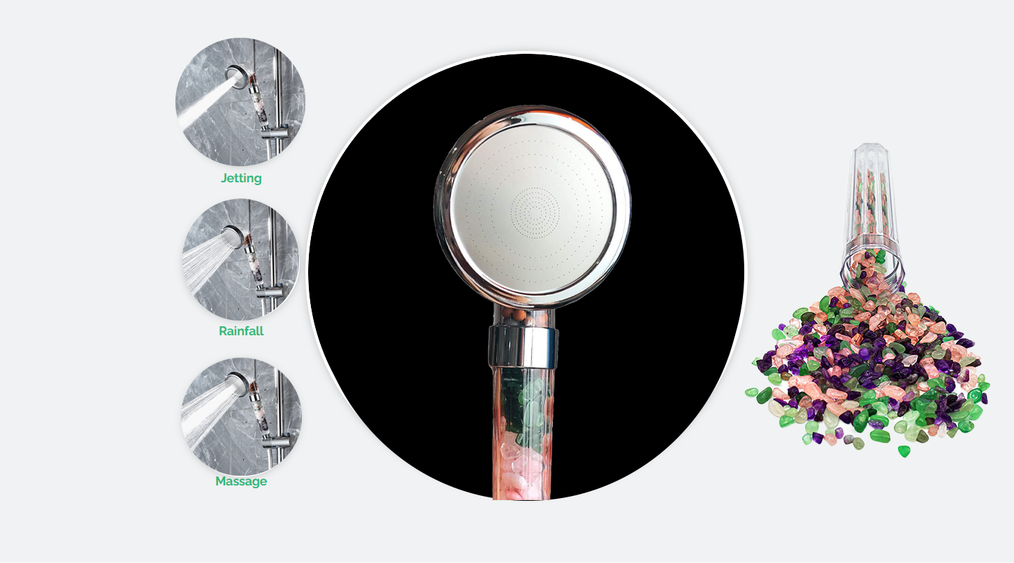 Chakra™ Shower head Amethyst, Ros Quartz & Green Jade Stones Up to 2 Times Increased Water Pressure Filters Water - Improves Hair & Skin Health Saves up to 30% on Water Usage 3 Shower Modes For Spa Like Shower